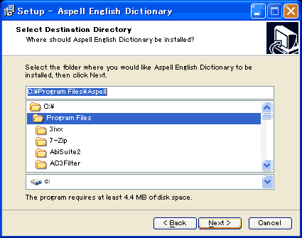 プログラムのインストール先を決定します。通常[デフォルト]のインストール先はASpellです。Nextボタンを押して、次へ進みます。