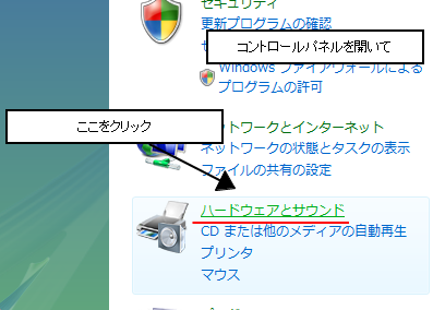コントロールパネルを開いて、その中の ハードウェアとサウンドをクリックして開きます。
