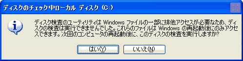 開始ボタンを押すと以下のようなダイアログが出ますので、ここではいボタンを押します。すると再起動後にチェックディスクを実行します。