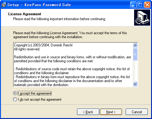 プログラムの使用承諾書/ライセンス契約書に同意を求められます。不具合が起きても責任をとらない等書いてあります。気になる方は読んでおきましょう。使用承諾書に同意できればI accept the agreementをチェックして、Nextボタンを押して、次へ進みます。