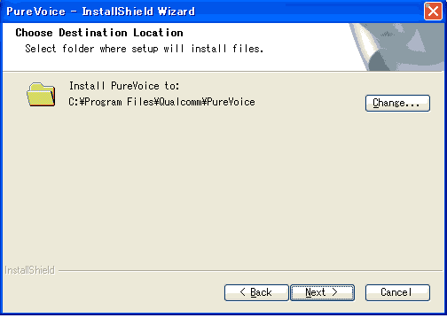プログラムのインストール先を決定します。通常[デフォルト]のインストール先はC:\Program Files\Qualcomm\PureVoiceです。(変更したい場合はChangeボタンを押してインストール先を選択します。)Nextボタンを押して、次へ進みます。
