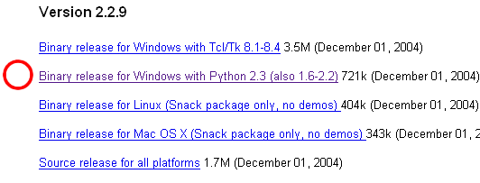 画面の中央Binary release for Windows with Python2.3をクリックしてファイルをダウンロードします。